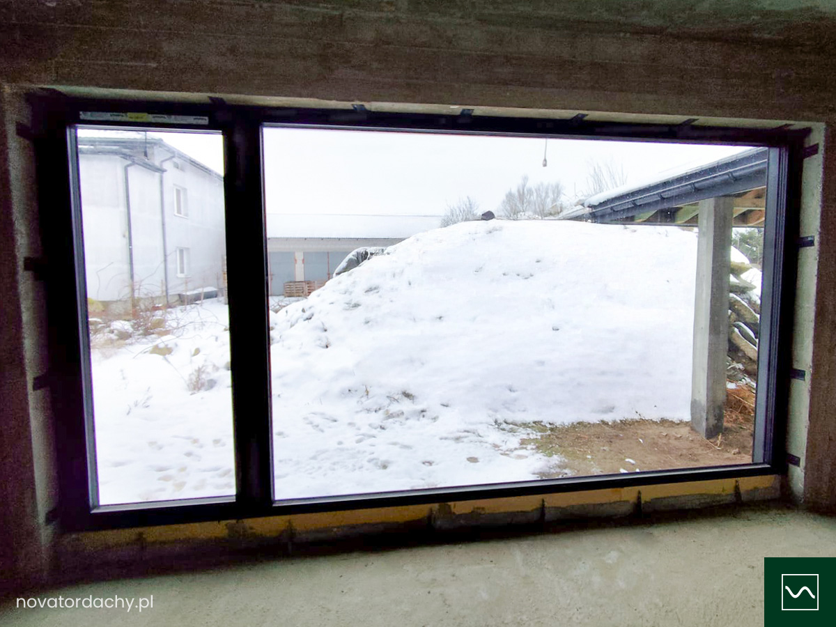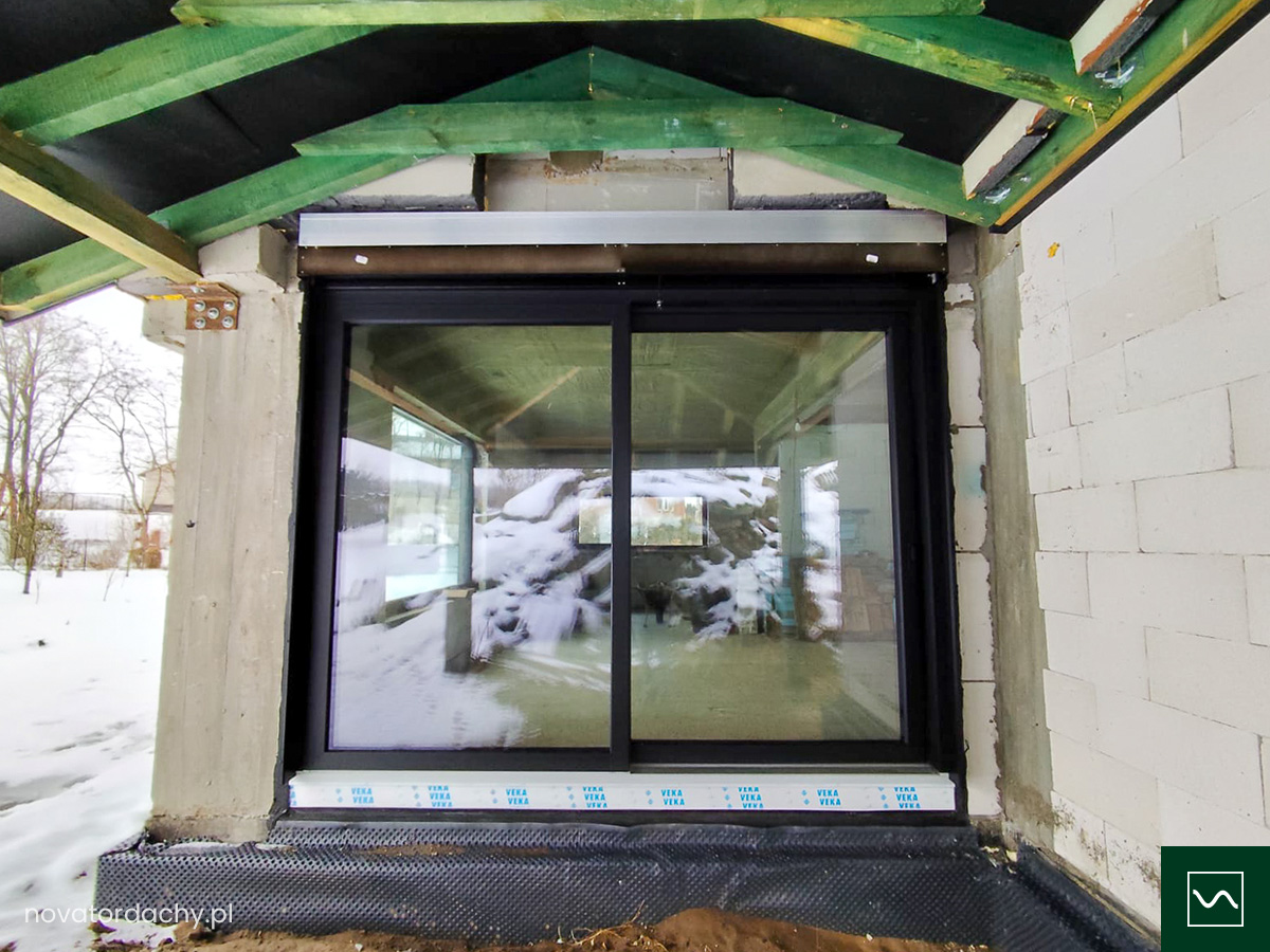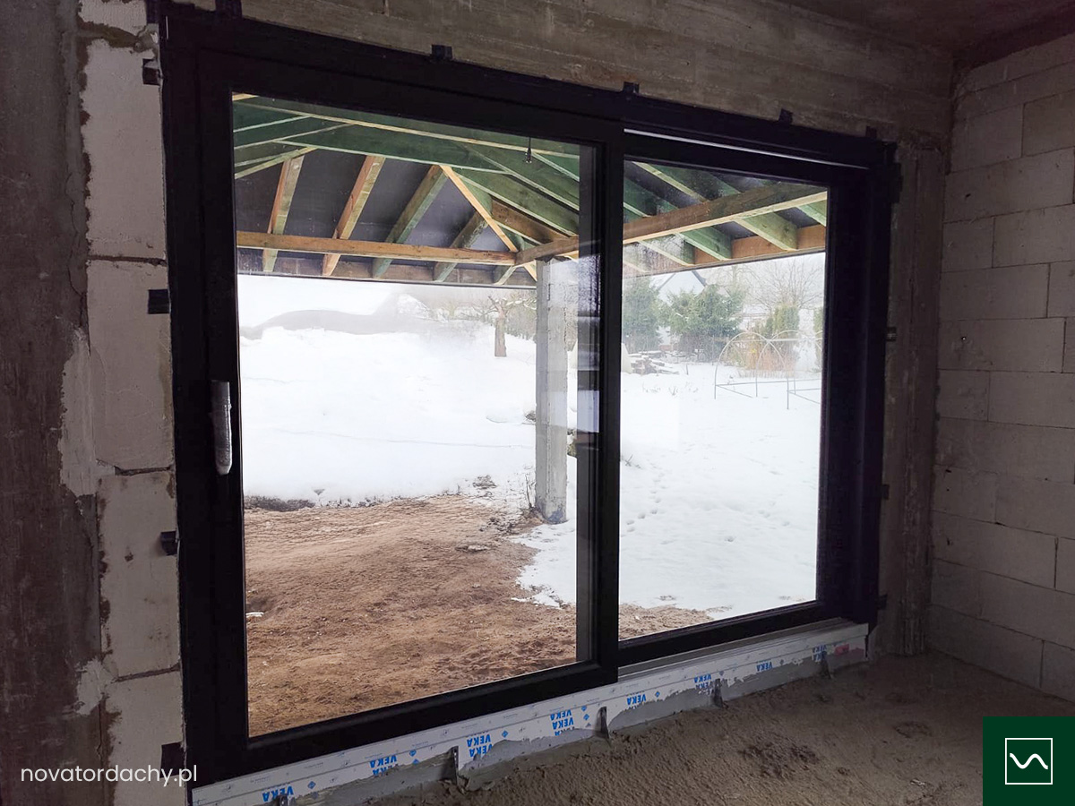 - Drzwi tarasowe zamontowane na podwalinach z klinarytu.