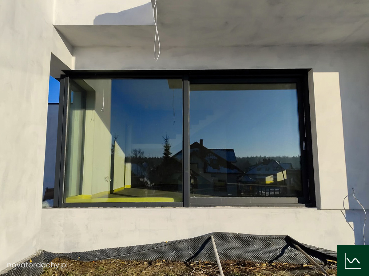 Nowoczesna realizacja firmy Novator obejmująca montaż okien Vetrex Lum’up, drzwi premium oraz systemów przesuwnych HST i rolet zewnętrznych, wykonany w technologii ciepłego, energooszczędnego montażu.